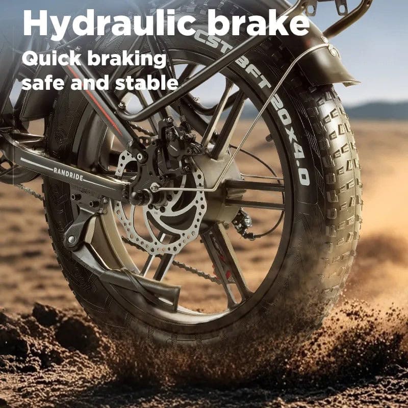 Tässä mallissa on tehokkaat hydrauliset levyjarrut, jotka varmistavat, että Randride YX20M sähköfatbike pysähtyy hallitusti ja turvallisesti. Jarrut eivät väsy, vaikka ajaisit vaihtelevissa sääolosuhteissa tai raskaalla kuormalla.